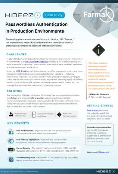 Explore las aplicaciones del mundo real de las llaves de seguridad de hardware en un entorno industrial. Descubra cómo Hideez puede mejorar la experiencia de inicio de sesión de sus empleados mediante el inicio y cierre de sesión de PC basado en proximidad, complementados con el inicio de sesión sin contraseña tanto en aplicaciones heredadas como en servicios web modernos.
